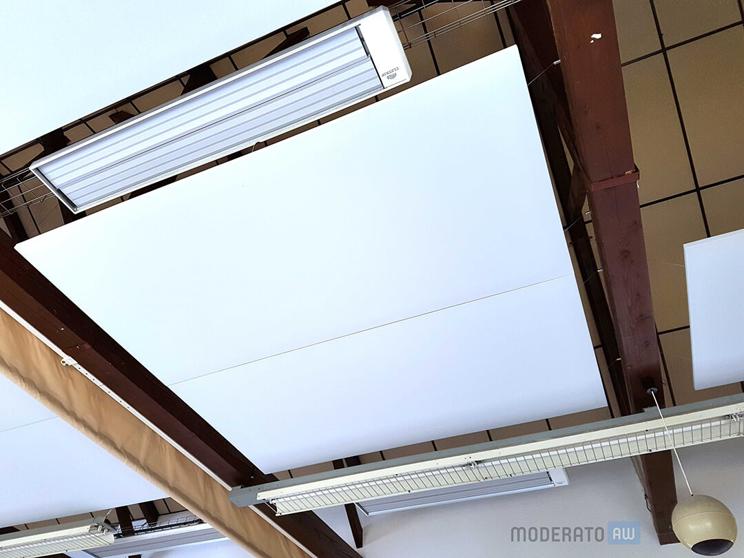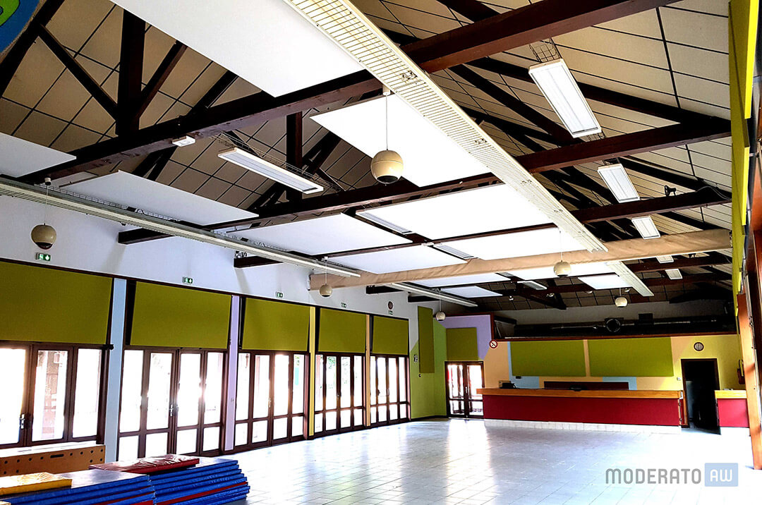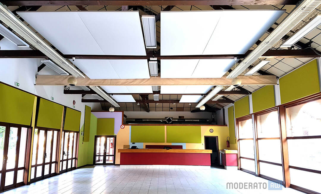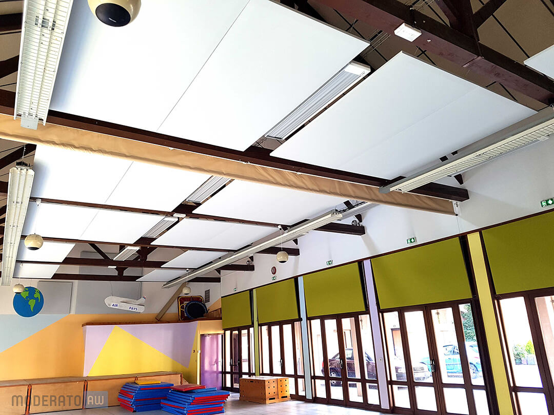 Moderato Archi a procédé à un traitement absorbant acoustique mural et suspendu sous le faux-plafond existant de la salle polyvalente de Saint-Bonnet-de-Chavagne.